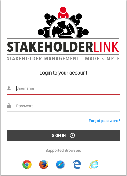 Open a web browser. SMS supports all major browsers (Internet Explorer 10+, Mozilla Firefox, and Google Chrome and Safari), but using Google Chrome or Firefox is recommended. Once your web browser is open, click on your address bar and type in the URL you were provided. An example URL: https://demo.stakeholderlink.com* All screenshots are taken from our demo site. Your site will have your logo, colors etc.