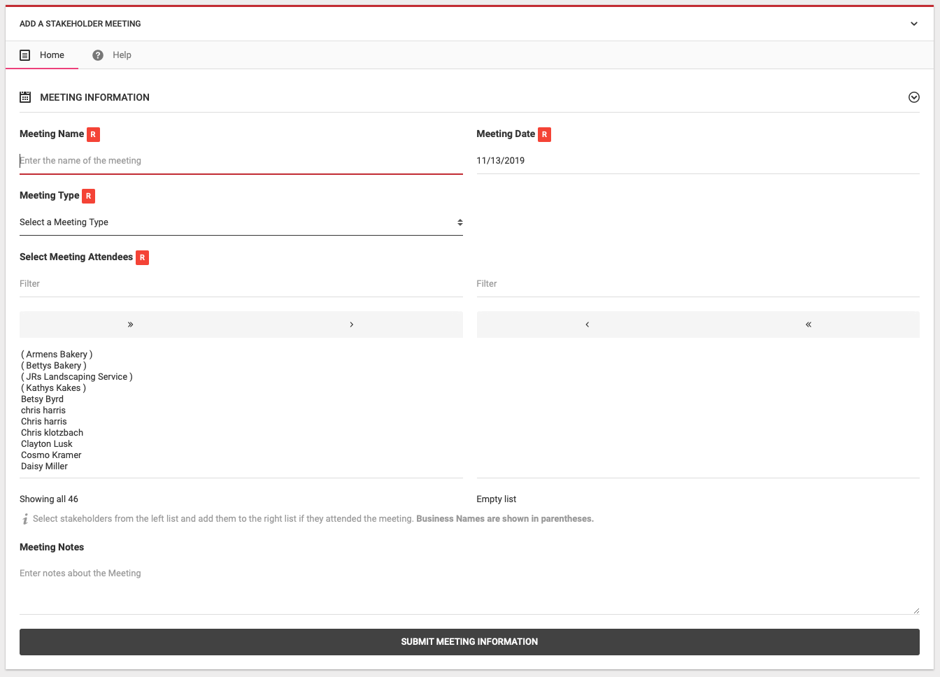 You have the ability to add a meeting to SMS. When you meet with multiple stakeholders at one time, you can add a meeting and this gives you the ability to flag multiple stakeholders that they attended the meeting.